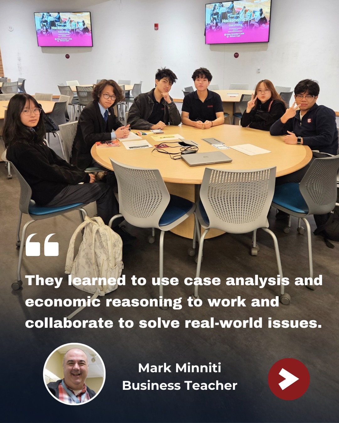 Business Teacher and Team Lead Mark Minniti shared what the students gained: “They learned to use case analysis and economic reasoning to work and collaborate to solve real-world issues. We specifically examined the role of Universal Childcare and the cost of living associated with it.”